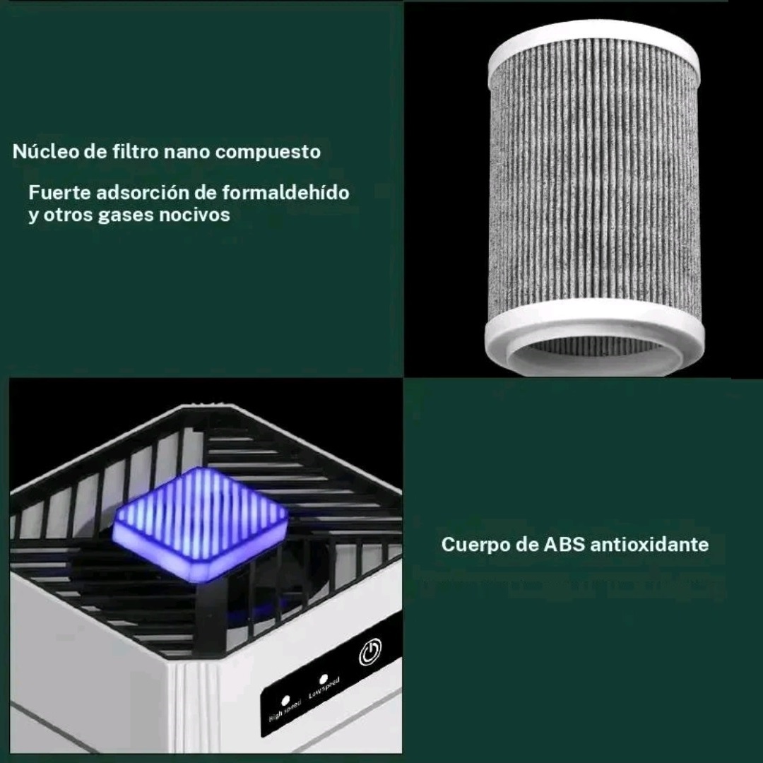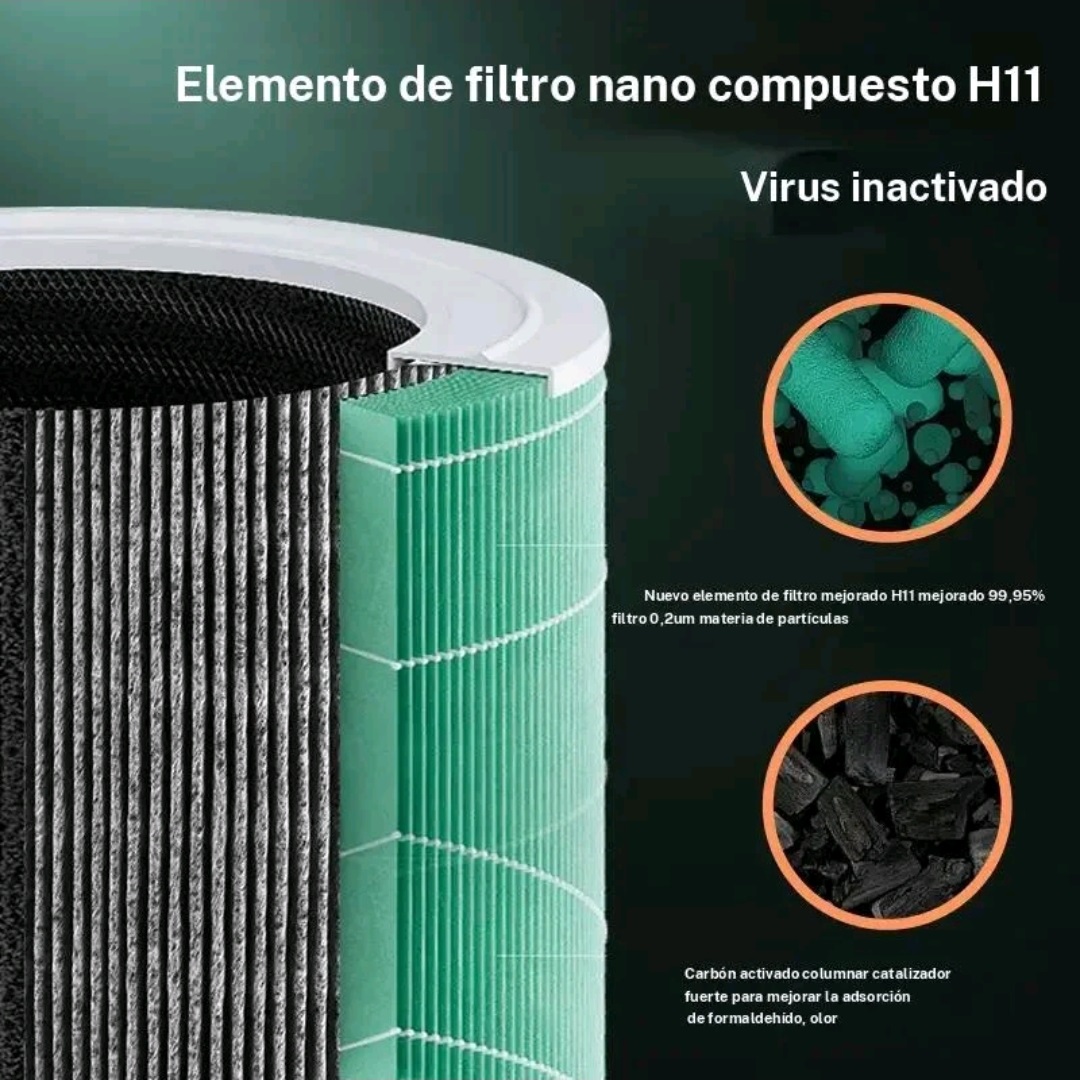 Filtro Purificador de aire Modelo O4 Operación silenciosa Cuenta con un nivel de operación de 22 dB. lo que permite dormir sin interrupciones mientras purifica el aire. Entrada de aire de 360° Sistema de entrada de aire para una purificación integral desde todos los ángulos en la habitación. Sistema de filtración Triple Equipado con un sistema de filtracción que reduce eficazmente lo alérgenos, el polvo y los virus. Eficiencia H11 95% de eficiencia para partículas de hasta 0.3 micras Modo de sueño Diseñado para minimizar el ruido y la luz para crear un ambiente tranquilo durante la noche. Luz nocturna azul Ofrece una luz azul relajante que realza el ambiente sin interrumpir el sueño. Area de filtración Para habitaciones de hasta 120 metros cuadrados Diseño compacto Mide 12 x 12 x 24 cm